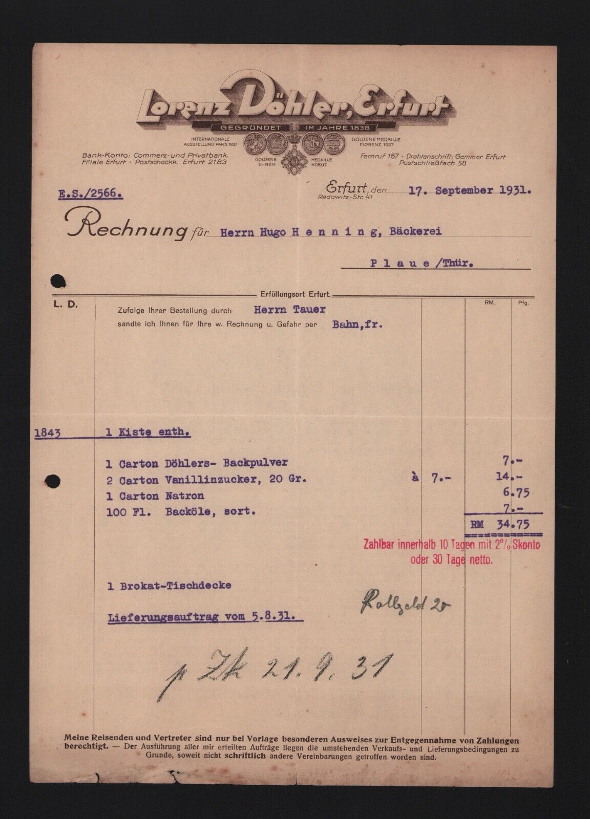Rechnung von 1931 - Lorenz Döhler eine Gewürzmühle 1838 in Erfurt gegründet. Döhler wird zum Markenartikler "Döhler Pudding", "Backfein" und "Backstolz" und ist in jedem Haushalt zu finden. Als bedeutender Nahrungsmittelversorgungsbetrieb der Ostzone des geteilten Deutschlands wird Döhler 1948 enteignet. 1952 wird der neue Produktionszweig für Grundstoffe und Aromen für die Erfrischungsgetränkeindustrie aufgenommen und das unternehmen zieht 1952 nach Darmstadt. Von hier aus expandiert Döhler in die ganze Welt.